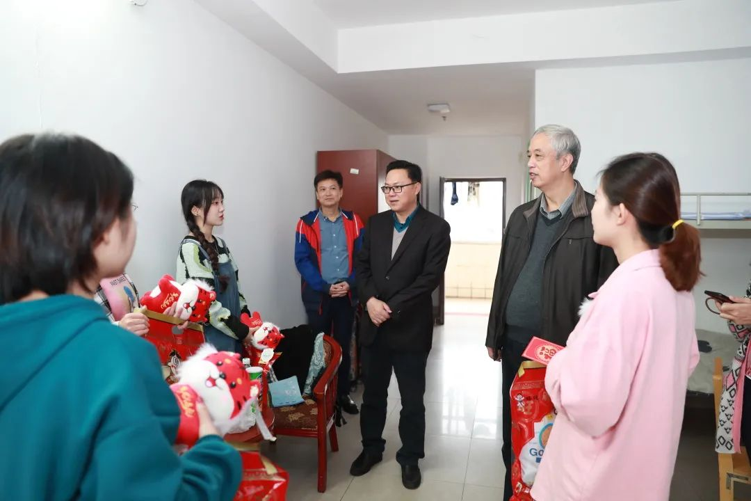 1月31日,琼台师范学院党委书记曹阳,党委委员、副校长林琛带着爱心满满的新年大礼包来到宿舍,给留校学生发放“压岁”红包,送上虎年公仔,和同学们一起贴对联、剪窗花。并了解同学们在校生活和学习情况,嘱咐大家合理安排学习和休息时间,及时向家人送祝福、报平安,希望同学们在学校度过一个温暖愉快的春节。