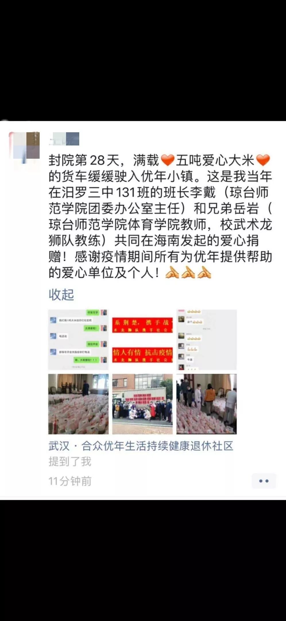 琼台师范学院武术龙狮队总教练岳岩介绍,这次募捐活动得到了武术龙狮队师生的大力支持。募集的大米原计划要送到相关医院,但因为医院只接收医疗物资,故转赠给距离火神山医院不到两公里的合众优年养老社区。根据社区统计,这批大米足够社区的700余名住养老人及工作人员食用40天。