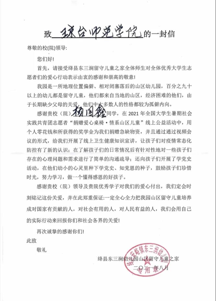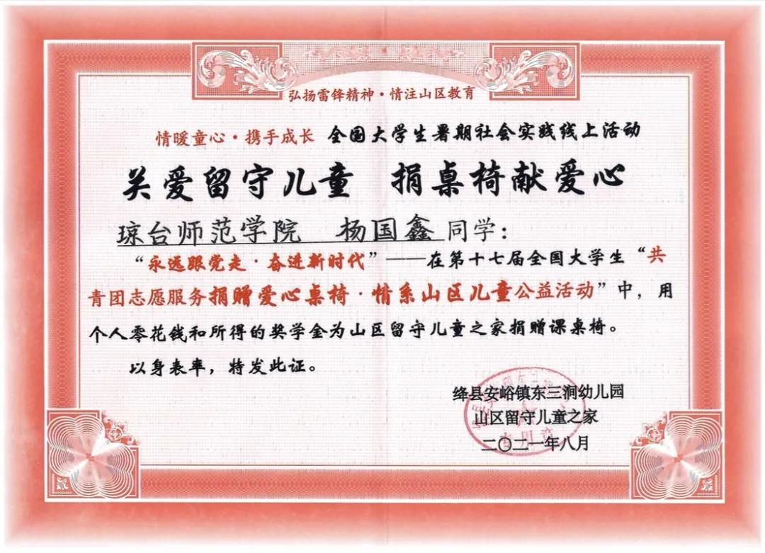 在此活动中,杨国鑫同学满怀热情地投入志愿活动中,他用实际行动为留守儿童捐赠了:学杂费、衣物、书籍、文具等,并与留守儿童结尾对子,实行一对一帮扶,并共同实施“六个一”素质提升工程:每月写一封书信,每月读一本好书,养成一个好习惯,练就一手好书法,学说一口标准普通话,掌握一门专业技术。