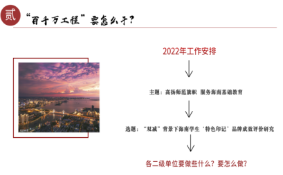 “百千万”实践调研团充分发挥师范院校和教师团队的专业优势,以课题的形式聚焦一个社会难点,学生们全过程、全方位参与建立“海南基础教育数据库”,服务海南自贸港建设,为海南教育改革发展提供数据支撑。同时,同步开展的志愿活动调动了大学生积极参与海南建设发展的积极性和创造性,强调青年学生在观察上和认识上的积累,在实践中和服务中成长。引导学生感受育人温度,并结合实践所思所得做好个人未来职业发展规划,实现社会与个人、知识与价值的双向赋能效应。