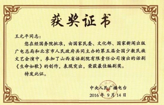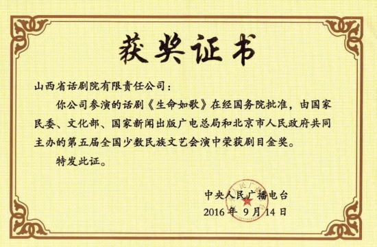 2016年5月31日,话剧《生命如歌》荣获山西省第十一届精神文明建设“五个一工程”优秀剧目奖证书、文件(中共山西省委宣传部)。