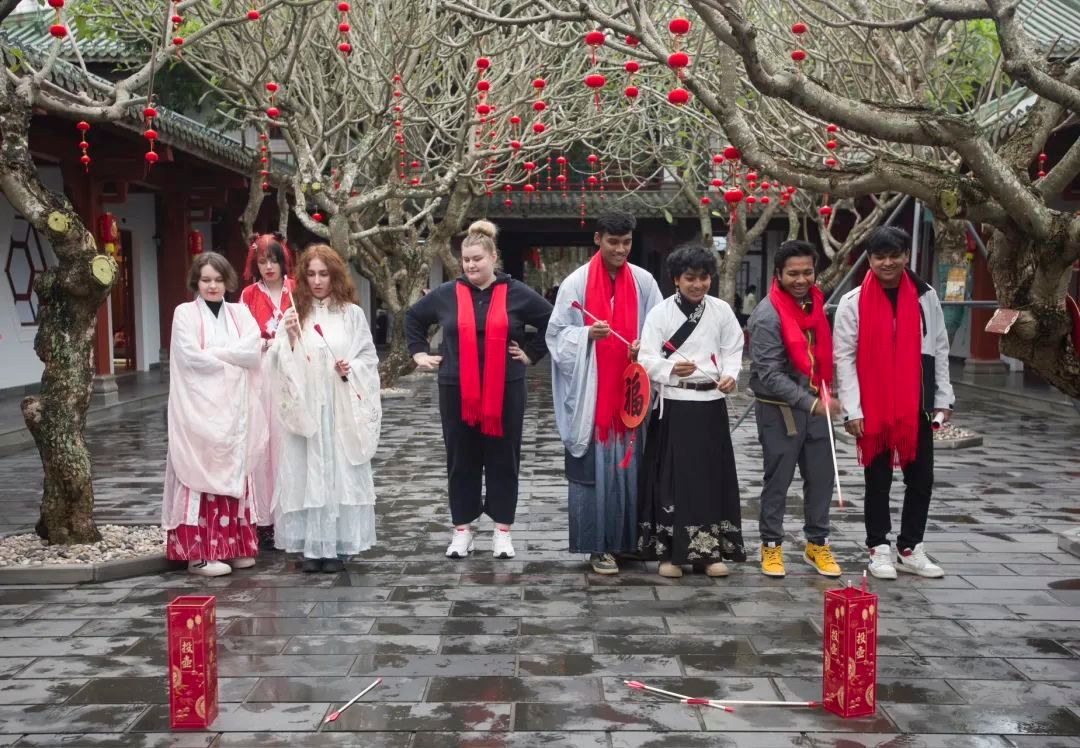 留校学生身穿各式汉服,跟随老师们一起铺纸研墨、现场挥毫,在红宣纸上写满新春祝福、吉祥话语;还有的同学们三两一组尝试剪纸,只见画纸折叠翻转,剪刀起起落落,不一会儿,一个个作品跃然于剪纸上,大家互相展示,成就感满满。写完字、剪完纸,同学们开始逛书院、赏梅香、猜灯谜、投壶、套圈圈,体验着充满传统中国味道的游园活动。