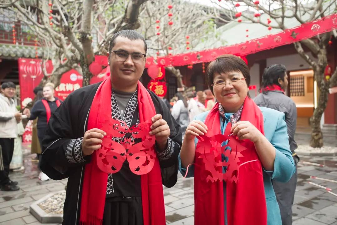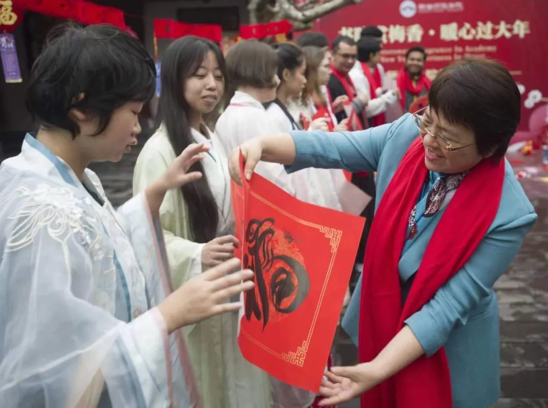 在热闹欢乐的游园活动中,刘湘洪、林琛与寒假留校师生代表一起写“福”字、赏梅香、投壶、剪窗花、写春联,温暖、欢快、祥和的节日气氛流淌在宣纸上、绽放在花香中、陶醉在歌声里、融化在味蕾中。