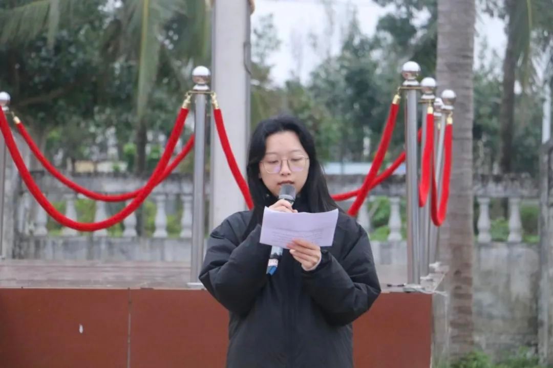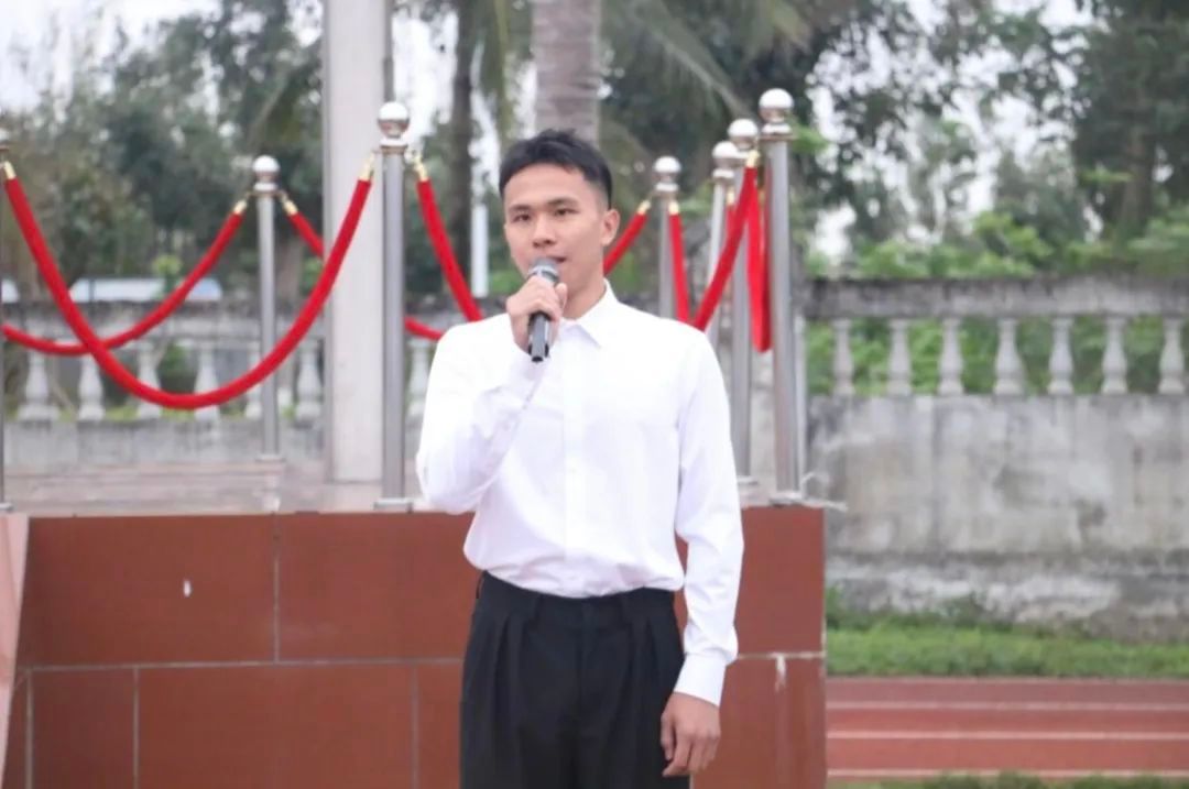 升旗仪式上,2022级小学教育4班的王强同学以“琼台精神耀,红色信念燃”为主题发表国旗下演讲。他通过“星火、传承、燎原”三个维度,回溯了琼台书院作为琼崖革命“思想策源地”的历史贡献,向陈垂斌、罗文淹等教师先驱及王文明、冯平等革命校友致以崇高敬意。他呼吁琼台师生应主动承担“红色校史守护者”与“琼台精神传播者”的双重使命,扎根海南基础教育一线,投身自贸港建设浪潮,以“躬耕教坛,强国有我”的实践行动赓续红色血脉,推动琼崖革命精神在新时代焕发磅礴力量。