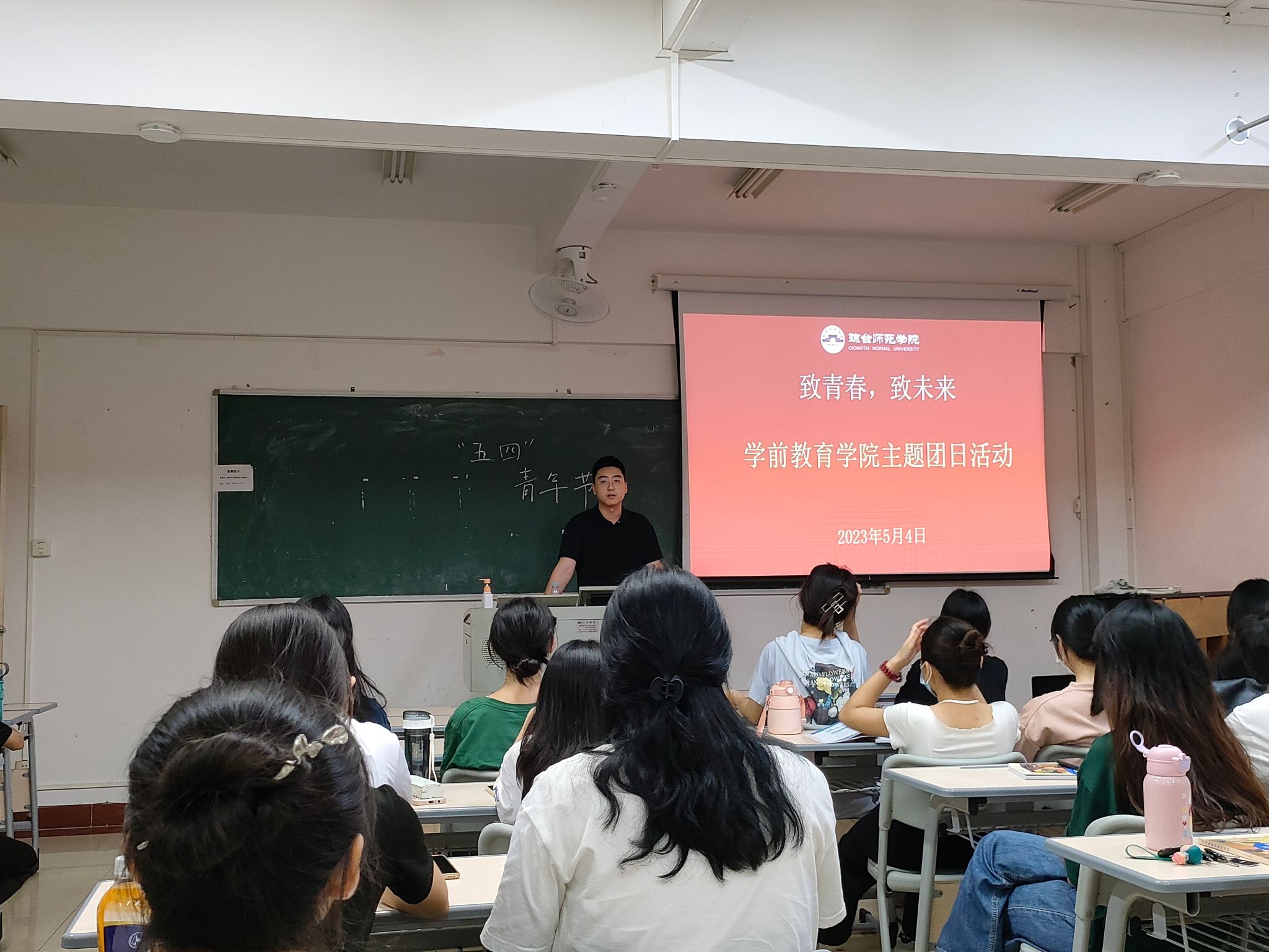 为深入学习宣传贯彻党的二十大精神,弘扬“五四”爱国主义精神,继承共青团优良传统,培养团结协作精神,丰富校园文化,引领广大团员青年坚定理想信念,汇聚青春正能量,5月4日晚上,学前教育学院特开展“致青春,致未来”纪念五四运动主题团日活动。本次活动由团委书记佟天一老师主讲。