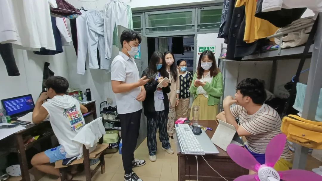 当前疫情防控形势严峻复杂,琼台师范学院认真贯彻落实党中央、教育部、海口市有关疫情防控的部署要求,从严从紧落实各项防疫举措。2022年4月9日晚上9:30,我校校团委林文曼副书记、何永亮老师,驻校辅导员王根老师、尹丽老师和苏豪老师带队,携校团委学生会干部,走访桂林洋校区各栋学生宿舍,对部分宿舍的晚归、卫生情况进行抽查。老师们在走访过程中传递疫情防控信息,提醒学生防范诈骗,检查宿舍安全隐患,关注学生心理健康,了解学生日常所需,力求为学生营造安全文明的学习生活环境。