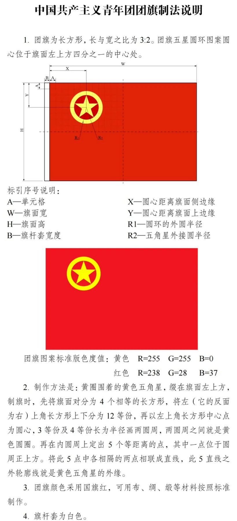 团的各级组织举办团日活动和面向社会开展重要活动,可以使用团旗。团的各级组织的新媒体平台,可以使用等比例制作的团旗图案。