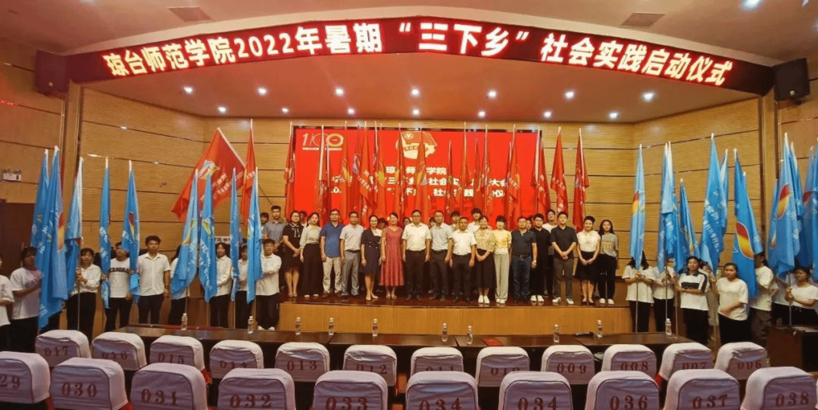出席本次大会的各位领导和嘉宾,他们分别是校党委委员副校长:林琛,党委学生工作部部长:柳善文,招生就业处处长:林琼花,科研设备处副处长:王伟,校团委副书记:林文曼。出席本次大会仪式的还有各二级学院党总支书记、各二级学院团委书记、辅导员代表、学生干部代表、2021年社会实践优秀团队代表、2022年社会实践立项项目成员。
