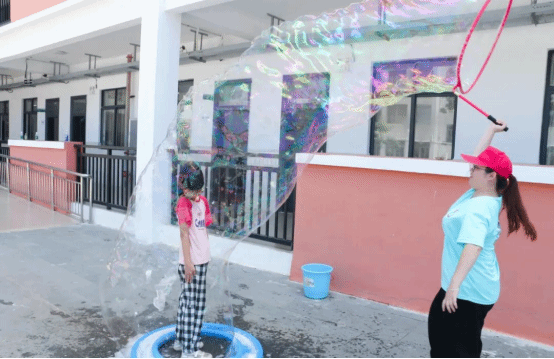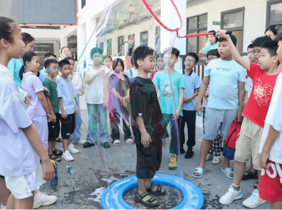 实践团带领学生们走出教室,亲身体验人体泡泡机的乐趣。五彩斑斓的泡泡在阳光下绽放,不仅为炎热的夏日增添了一抹清凉与浪漫,更让学生们直观地感受到了科学的无限魅力与乐趣。此次活动不仅激发了学生对科学的浓厚兴趣,也为他们打开了探索未知世界的大门。
