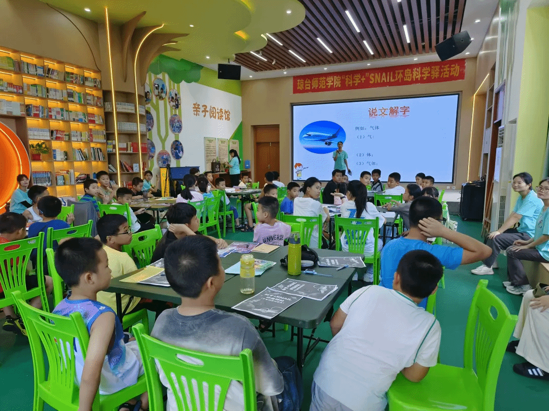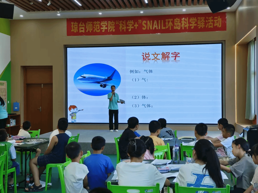 在昌江黎族自治县青少年活动中心,团队以“说文解字”为主题,围绕“颂、读、讲”三方面能力开展推普活动。小老师以科学课堂的形式,讲科学知识与普通话训练结合起来,让小朋友思考文字来源以及组词、造词能力,并以标准普通话诵读课堂内容,例如老师带着小朋友一起讨论含有“气”和“体”的科学词语。提高了诵读能力、思考能力和口语表达力,让他们从积极思考和回答问题中重温汉字的历史渊源,从诵读中感受汉字的音韵之美。