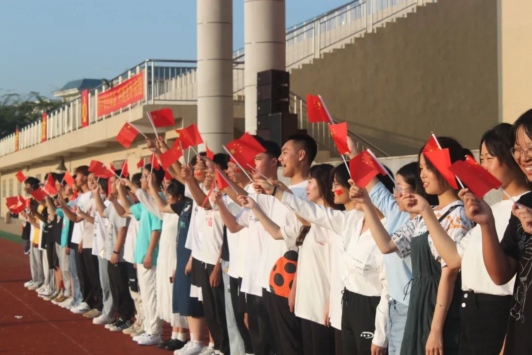 同学们在主席台下,用力挥舞着手中的国旗。琼台学子坚信:少年不惧岁月长,彼方尚有荣光在。